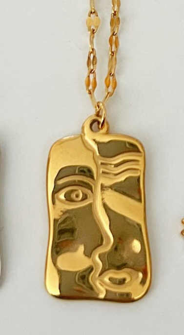 “Sanatsal yüz figürü detaylarıyla öne çıkan bu gold kolye, modern ve özgün stilinizi tamamlar.” ✨