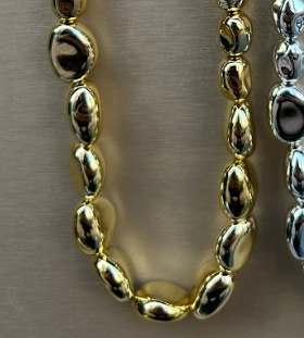 “Oval boncuk tasarımıyla dikkat çeken gold kolye, iddialı ve modern şıklığıyla kombinlerinize güçlü bir hava katar.” ✨