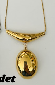 “Parlak gold oval ucu ve modern tasarımıyla bu kolye, güçlü ve şık bir görünüm sunar.” ✨